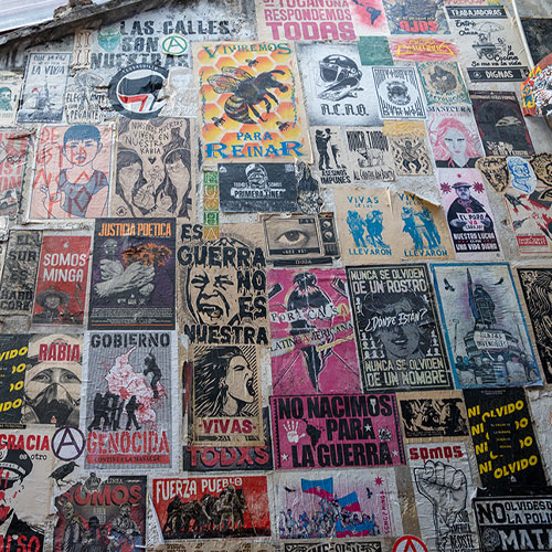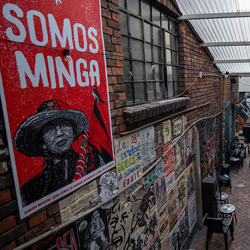 El cartelismo, el muralismo y el Grafitti fueron las formas más representativas y el lenguaje que los jóvenes encontraron para simbolizar el inconformismo,rebeldía y denuncia. La casa de la paz jamás será ajena a ningún fenómeno social y/o político, abrimos nuestras puertas desde el primer momento a las distintas expresiones con la certeza que harían de nuestro espacio un lugar de identidad y denuncia. El primer mural que se pintó en la casa fue realizado por el artista Sur-Terraneo perteneciente al colectivo M9S, proceso que nace de la noche del 9 de septiembre del 2020, donde fueron asesinadas 14 personas por tiros de la policía luego de las jornadas de denuncia del asesinato del abogado Javier Ordoñez en Bogotá, se encuentran en el fondo del patio y la técnica utilizada es esténcil.